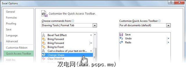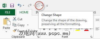 从列表中,选择更改形状,并将其添加到右侧的快速工具栏选项中。