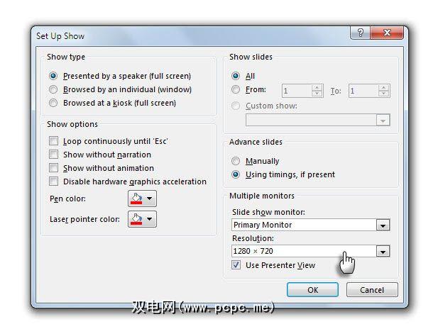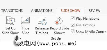 在创建幻灯片后,设置PowerPoint以供显示。转到幻灯片>设置幻灯片。