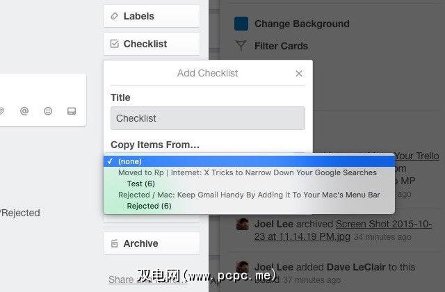 对于清单:打开要在其中复制特定清单的卡。点击右侧边栏中的清单。现在,您应该会看到一个添加清单对话框。使用从...复制项目下拉菜单,选择要用作模板的清单,以创建新清单。