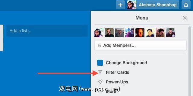 要调出任何面板的过滤器选项,请首先导航到该面板。在右上角找到您的用户名。单击其下方的显示菜单链接,然后单击滤卡。。或者您可以绕过所有内容,只需按 F 键尝试在当前板上进行过滤。