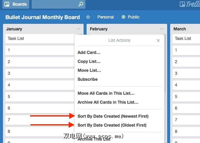 使用Trello的内置排序功能,您可以按创建日期在列表中排列卡片。单击列表名称旁边的列表操作按钮以从两个排序选项之一中进行选择: