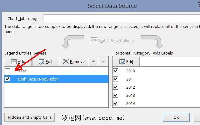 突出显示年份和总人口列,然后单击插入,然后从菜单中选择一个折线图,就会在您的电子表格中显示一个折线图。右键点击图表,然后选择选择数据源。确保未选择年份。