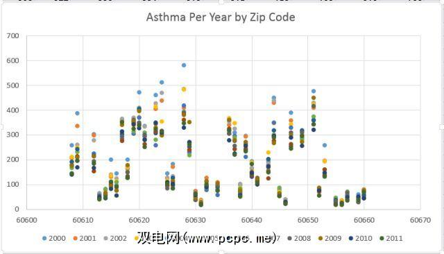 以显示借助这种图表类型,我以邮政编码为单位,绘制了2000年至2011年芝加哥哮喘住院的人数。