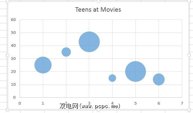 这是两个值的典型XY绘制数据点(该点是“气泡"),另外还有两个决定气泡大小的值。例如,使用这种图表,您可以绘制出多少青少年去看电影,但是每个数据点(气泡)的大小可能代表组成该数据集的女性人数。