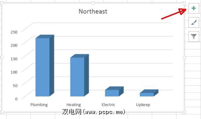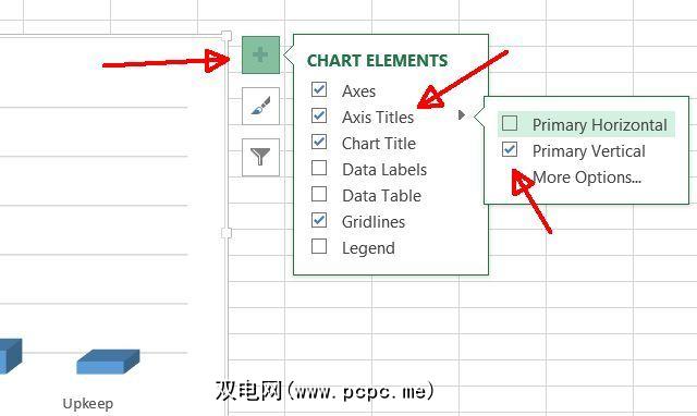 不幸的是,默认情况下,图表没有任何垂直或水平标签,因此您需要添加这些标签,以便人们知道数字的含义。这样做很容易。只需单击图表右上角的“ +"按钮,确保已选择轴标题,然后仅选择主要垂直。