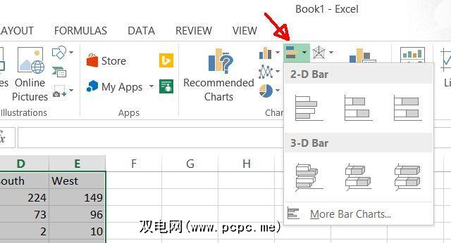 现在点击插入 >在菜单中就像以前一样,这次单击柱状图下拉菜单右侧的条形图下拉菜单。
