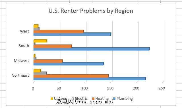 可以看到,柱形图和条形图是比较一个数据集的分类数据或比较多个数据集的分类数据的一种非常酷的方法。例如,上面的区域图非常清楚地表明,南部和东北部的管道问题更加严重,而南方在维护房地产方面比其他任何人都挣扎得多。