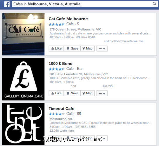 Facebook搜索图可以非常轻松地找到朋友的被动推荐。例如,我搜索了墨尔本的Cafes,发现了一些很棒的主意,仅仅是因为我的许多朋友都喜欢这些页面。试试这个可以满足您的住宿,旅游景点,活动以及所有食品和娱乐需求。并且不要忘记,您可以在右侧缩小搜索结果的范围,以显示更具体的数据,例如您的朋友是否去过该地点。如果您想找到自己喜欢的酒吧,请考虑将其范围缩小到喜欢您最喜欢的乐队的人喜欢的地方。