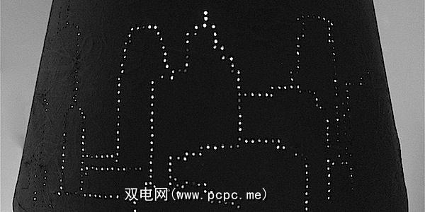 结果是一盏灯,显示了城市景观的针刺轮廓,在黑暗的房间里,它可以用来照亮否则为空白的墙壁。