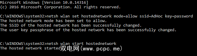 netsh wlan set hostednetwork mode=allow ssid=AdHoc key=password