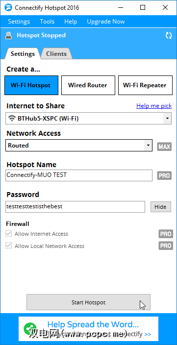“ Connectify热点使您的所有设备感到满意",这确实看起来会是这样。它是您将要使用的最简单,最直观的Wi-Fi热点软件之一,可为日常用户提供功能强大的解决方案。您可以将有线连接共享为热点,也可以共享现有的无线网络。如果您想升级到PRO或MAX版本,还可以与附近的那些共享3G或4G LTE。