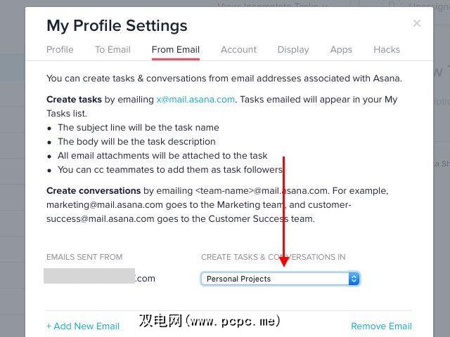 就像在Wunderlist中一样,您可以将不同的发件人电子邮件地址添加到您的Asana帐户中,并将每个电子邮件地址与特定的工作区或组织配对以创建任务。
