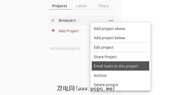 在Todoist中,电子邮件任务功能仅适用于高级订户。如果您是同一人,则可以通过右键单击侧边栏中的项目名称,然后从下拉菜单中选择向该项目发送电子邮件任务来使用它。在打开的项目中,您会在项目名称最右边的扳手-铅笔图标后面找到相同的选项。