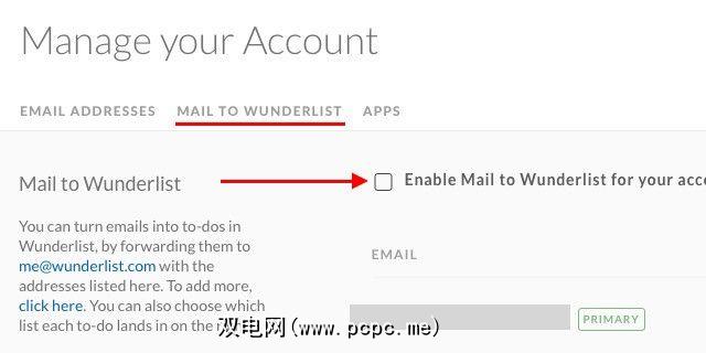 在开始将电子邮件转变为Wunderlist任务之前,您需要通过转到Mail to Wunderlist并选中为帐户启用Mail to Wunderlist旁边的框来启用帐户的电子邮件访问权限。