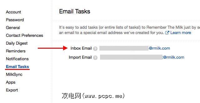 打开“记住牛奶"帐户,单击右上角的个人资料图片,然后转到“ 设置>电子邮件任务"。请参见收件箱电子邮件?这是您可以用来从收件箱转发任务的唯一电子邮件。您还可以在“记住牛奶"的“欢迎"电子邮件中找到该地址。