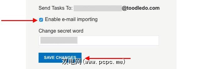 在下一个屏幕上的电子邮件服务下,选中启用电子邮件导入旁边的框,然后点击保存更改按钮。然后,您将看到您的秘密电子邮件地址。