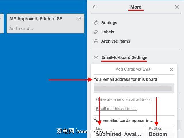 如果您想将电子邮件作为任务发送到Trello中的任何委员会,则首先必须找到委员会的唯一电子邮件地址。为此,请打开面板,然后单击最右侧的显示菜单。您会看到一个隐藏的 Menu 侧边栏弹出。单击更多>电子邮件到板设置,以显示Trello分配给当前板的电子邮件地址。