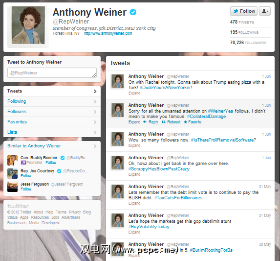 我不得不说,如果有可能以最糟糕的方式获得Twitter粉丝的奖项,那么Anthony Weiner将获得冠军。纽约市代表去年因疯狂的手机照片滑稽动作成为头条新闻,人们仍然没有停止搜索他的Twitter流。也许人们以为他会放任自己,然后开始发布更多有关他本人的疯狂照片?