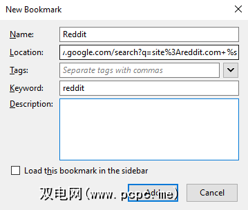 在Firefox上,按 CTRL + B ,右键单击未排序的书签,然后选择新书签。填写必要的详细信息,然后将与上述相同的URL字符串粘贴到 Location 字段中。