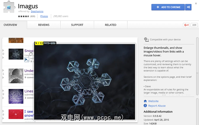 如果您属于这一类,则可以通过安装Imagus扩展程序来改善体验。只需将鼠标悬停在链接上,它将放大缩略图并显示图像或视频。