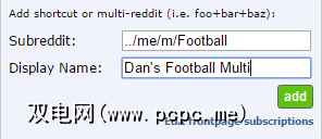 遗憾的是,RES没有提供简单的“单击添加"功能来将multireddit放置在快捷方式栏上,但是您可以做一些修改。只需单击右上角的 + 图标,然后在标有 Subreddit 的字段中键入 ../ me / m / [multireddit名称] (将[multireddit名称]替换为分配给创建内容的任何内容。)。