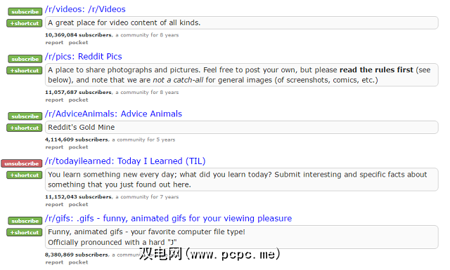 首先,查看Reddit的主要subreddit列表。它将一些当前趋势的子Reddit与您当前订阅的子Reddit混合在一起。
