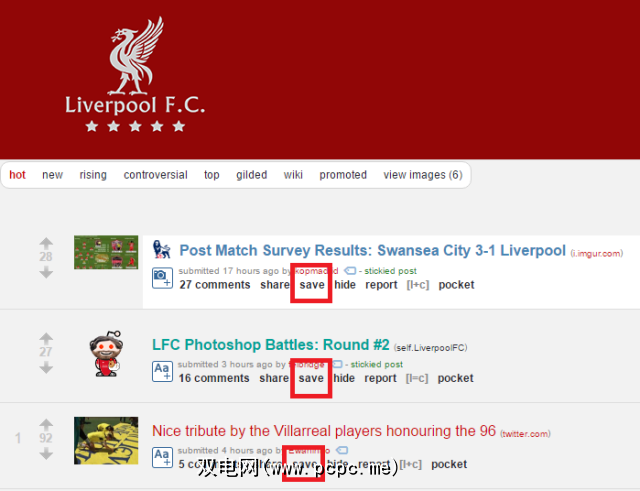 要保存整个主题,请在subreddit主页上单击主题标题下的 Save 。要保存单个评论,请点击其下方的保存按钮。
