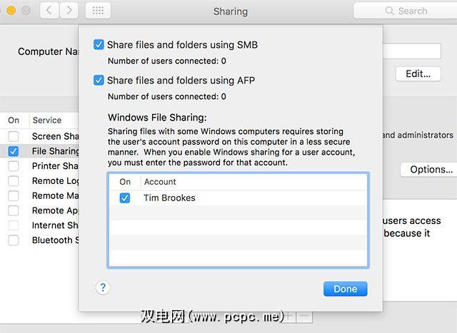 您可以在系统偏好设置>共享下指定共享文件夹,添加用户,并在选项下启用Windows计算机的SMB共享。请务必阅读我们的完整指南,了解如何在Windows和Mac计算机之间共享文件。
