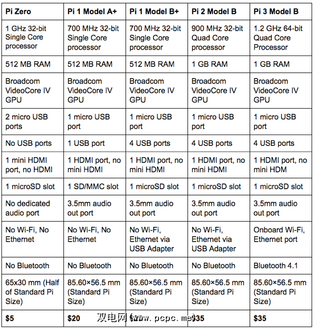 当前,只有部分型号可供购买。以下是各种Raspberry Pi型号的快速比较表: