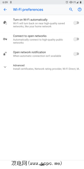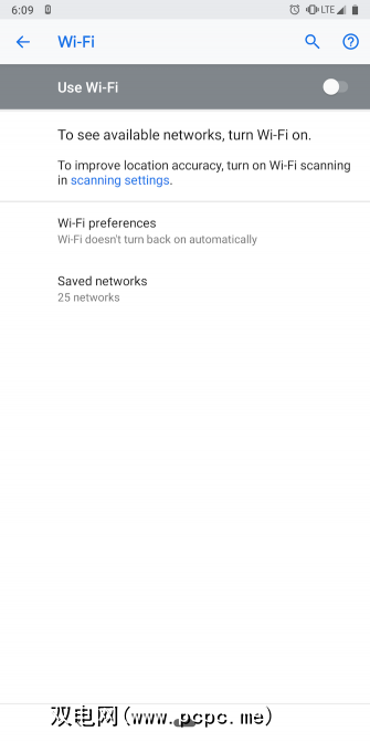 自Oreo更新以来,Android附带了一项功能,即使您已禁用Wi-Fi,该功能仍可继续寻找开放的Wi-Fi网络。要关闭它,请打开设置>网络和互联网> Wi-Fi 。在 Wi-Fi偏好设置下,取消选中自动启用WLAN 选项。