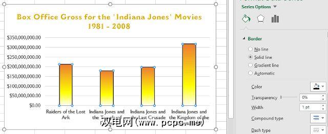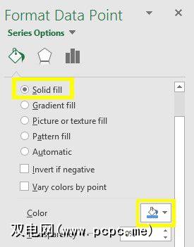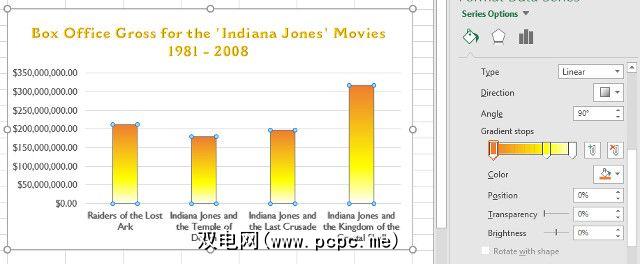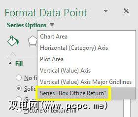 虽然纯色填充会产生纯色,但渐变填充是两个或多个阴影的混合。这可能是非常吸引人的效果,但是为了确保它不会对可读性产生负面影响,我们将对所有列应用相同的填充。要进行选择,请双击一列,然后使用边栏中的 Series Options 下拉列表来选择整个系列。