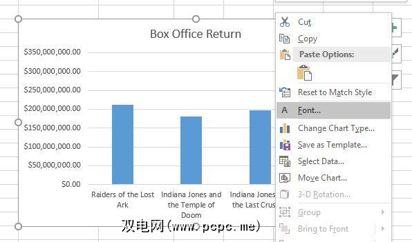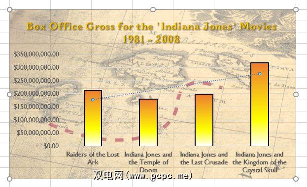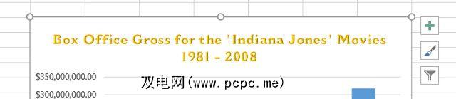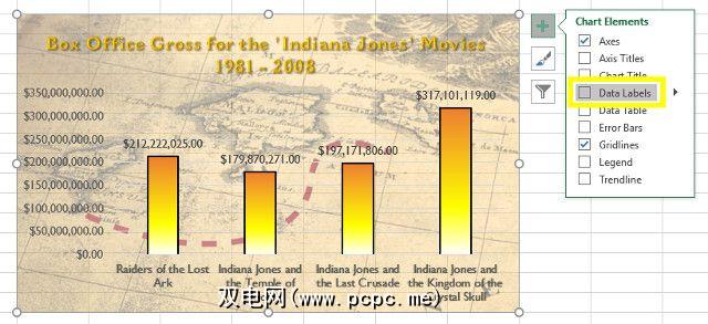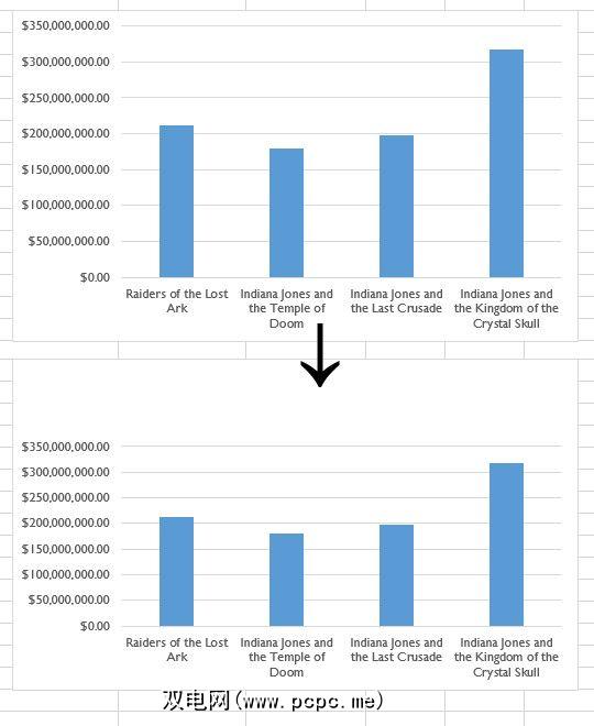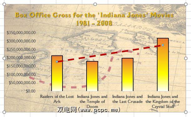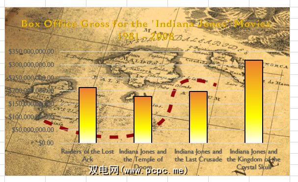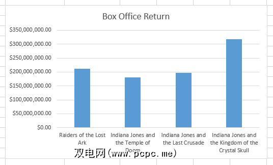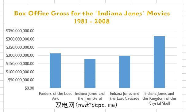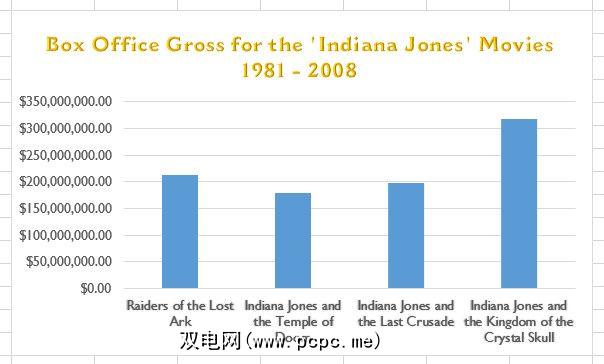 现在我们的标题位于位置,是时候考虑图表的其他区域了。我们的Y轴非常容易理解,因为它由固定间隔的金额组成。但是,我们的X轴列出了印第安纳琼斯电影的各个名称,因此使它们尽可能清晰易读是有益的。