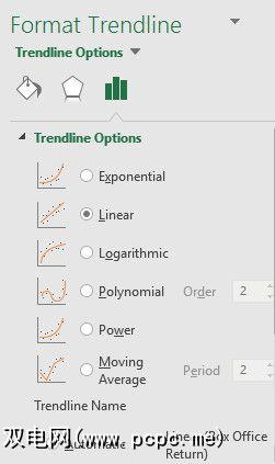 转到我们之前用来更改公式的格式侧边栏的 Trendline Options 设置用于计算线。我们大多数人都不必担心图表中的这一元素如此详细—但某些教授将接受完美的多项式趋势线。