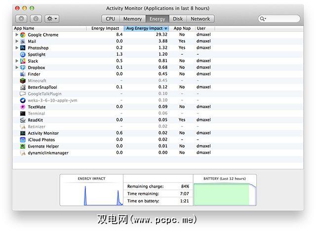 此外,活动监视器还具有能源标签,以便您查看哪些应用需要耗电。我发现自己经常使用Activity Monitor中的 Energy 标签,因为我一直想确保自己没有运行任何会严重消耗电池电量的东西。