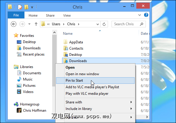 要轻松访问文件夹,可以将其固定到Windows 7或“开始"上的“开始"菜单Windows 8屏幕上。它会出现在快捷方式或磁贴列表中,就像Windows桌面应用程序一样。