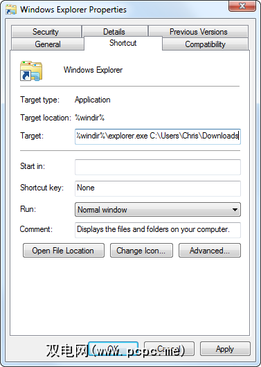 在“快捷方式"选项卡上,添加以下路径:您要使用的默认文件夹到“目标"框的末尾。例如,如果您的用户帐户名为Chris,并且您想在每次从任务栏打开Windows资源管理器时打开“下载"文件夹,则将使用以下行: