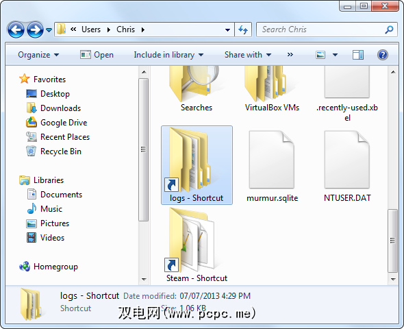 您还可以通过创建重要文件夹的快捷方式来跟踪它们。例如,如果您使用Pidgin作为即时通讯工具,则Pidgin聊天日志文件夹位于C:\ Users \ NAME \ AppData \ Roaming \ .purple \ logs。访问此文件夹非常不方便。如果要经常访问日志文件夹,则可以创建一个将您带到那里的快捷方式。
