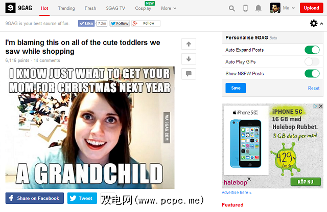 一旦您进入9GAG。 com,则会在“热门"标签下向您显示最新的帖子,以及右上角的一些设置,然后是选项,一些广告以及指向其他热门帖子的链接。您可以在不创建帐户的情况下使用该网站,但是那样您的喜欢的对象将不会被保存,并且您将无法上传任何内容。