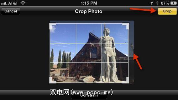 首先,您只需点击右上角的 Edit 按钮即可快速裁剪照片。打开的照片。接下来,点击右下角的 Crop 按钮图标(下面的屏幕快照中未显示),然后调整手柄以裁剪出您在照片中不需要的任何内容。例如,在这张照片中,我想剪掉我在拍摄时没有注意到的分散注意力的灯杆。最后,点击黄色的“裁切"按钮以应用裁切。
