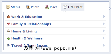 要添加生活事件,请转到自己时间轴顶部的状态更新框。您会看到“状态",“照片"和“地点"旁边的最后一个选项是“生活事件"。单击后,您可以选择五种不同类型的生活事件: