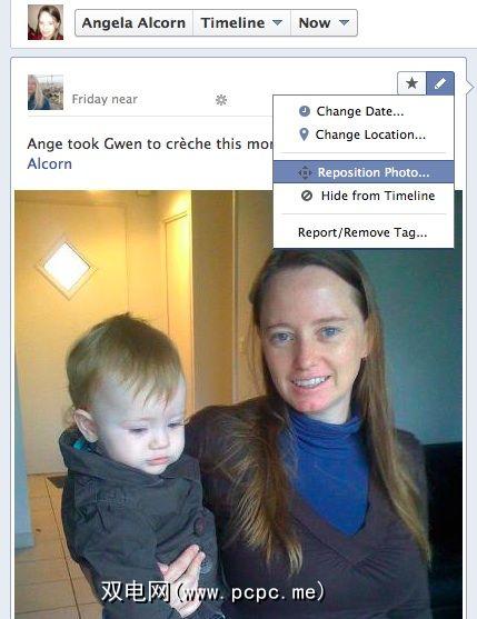 移动照片实际上非常简单图片。转到照片时间轴条目右上角的铅笔图标,您应该会看到“重新放置照片"选项。这样您就可以移动图片,直到对时间轴上显示的部分满意为止。您实际上并没有裁剪图片或以任何方式对其进行编辑,因此不必担心。它所做的只是改变人们在您的时间轴上看到的内容。