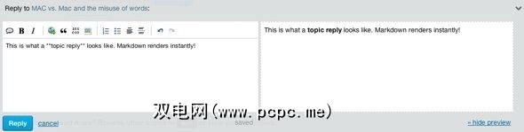 回复和撰写新主题都在一个栏中进行浮在屏幕底部。您可以使用BBCode或Markdown进行编写。窗格的右侧会在您键入时呈现文本,从而无需单击“预览"按钮即可轻松发现任何格式错误。