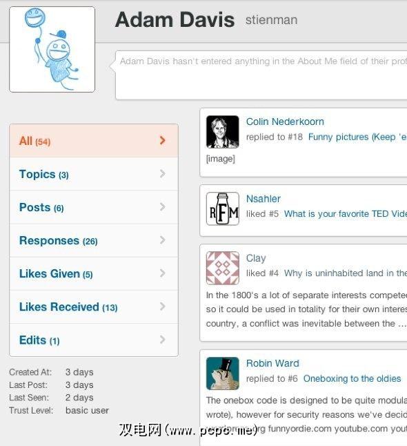 但是,Discourse页面与我之前见过的任何其他论坛用户页面都相去甚远。侧边栏使您可以对该用户的活动进行切片和切块,还可以单击他们发表的每条帖子,查看他们喜欢的内容,等等。请注意左下角的“信任级别"条目:就像Stack Overflow(以及其他StackExchange网站)一样,Discourse内置了一个自我监管系统。浏览Discourse的“元"论坛(该论坛包含有关平台的讨论的论坛)并没有揭示有关此功能的更多信息,但我确实疏通了有关自动信任的主题,其中提到了“标志"和帖子之间的比率,以此作为一种方法。检测不良用户(即,如果您发布的帖子不多,但是很多帖子被标记为不良内容,则您应该值得低信任度。)