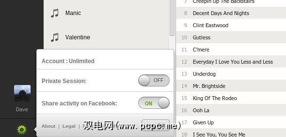 您要做的第一件事就是检查此会话的选项。这些选项仅限于打开或关闭私人会话,以及选择是否在Facebook上共享您的Spotify活动。这也是您注销帐户的地方。