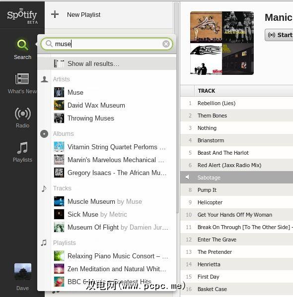 “搜索" 选项简单而简约。点击“ 搜索"会弹出一个文本输入框,输入每个字母后,结果将在下面更改。因此,搜寻Muse首先会出现Nicki Minaj和Bob Marley,然后是Mumford&Sons和Muddy Waters,然后才出现Muse。
