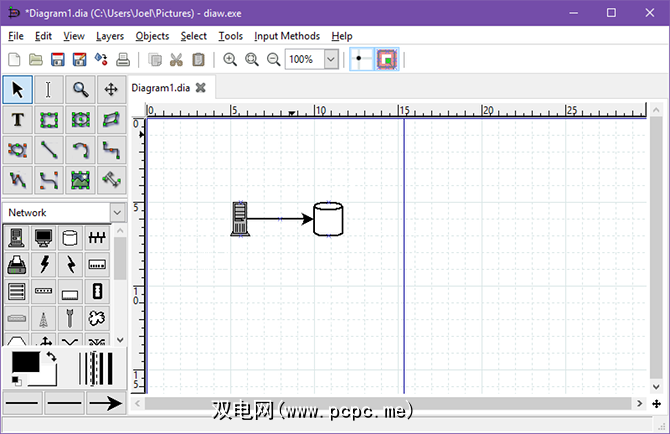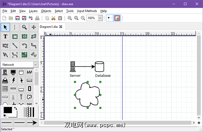 在左下角,您会看到Dia从一组流程图符号开始。一切都很好,但是您可以根据需要从下拉菜单中选择其他“工作表"。 Dia带有各种符号集,包括电路,网络,UML等。