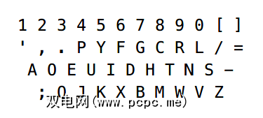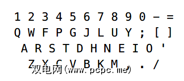 Dvorak键盘的目标是确定QWERTY在打字错误频率,次优打字速度,和打字员的手指疲劳。经过至少18年的研究和研究,Dvorak布局诞生了: