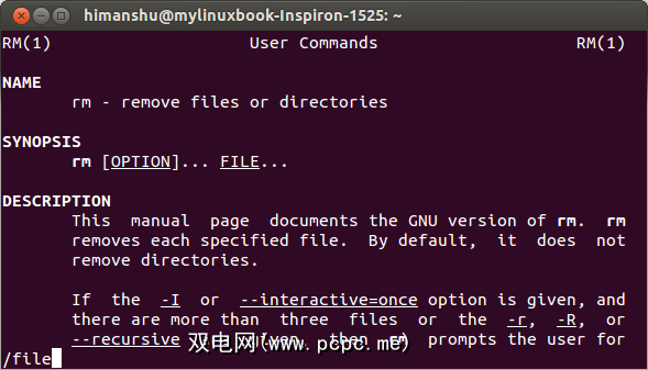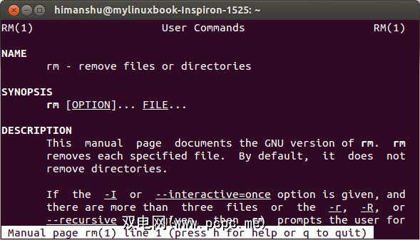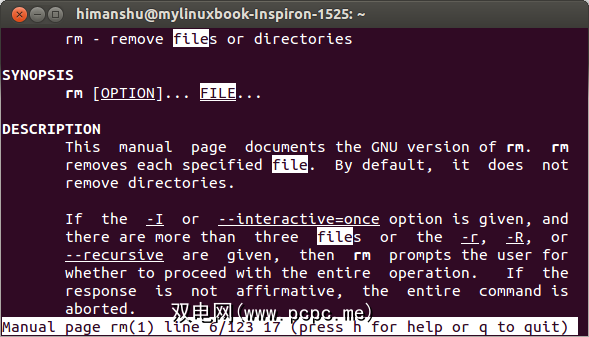 您无需下载帮助指南或购买书籍即可学习有关Linux中命令的更多信息。 Linux上已预装了所有标准命令的手册。只需执行命令 man [命令名称] <命令名称>,该命令的手册页就会打开。例如,这里是手册,