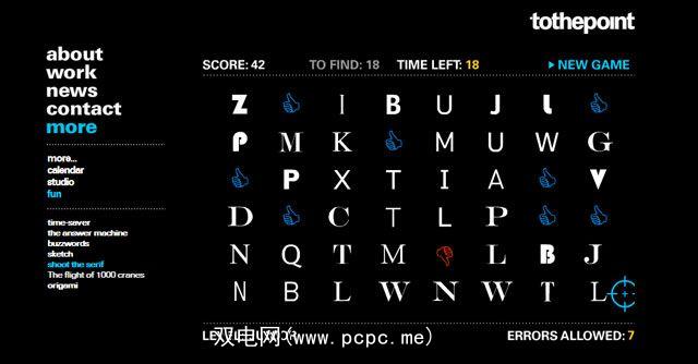 好吧,我确实设法在其中嬉戏地输入了一些字体。但这一切都指出,玩排版很有趣。如果您发现有关字体和字体的Web应用程序很有趣,那么您几乎不需要哄哄。 《 Kern Type》是一款以娱乐性和视觉愉悦的方式教授这一原理的游戏。屏幕上显示由不同字体组成的单词。您对字体间距的准确度得分很高。您的工作将与设计师(打字员)的工作进行比较,如果做对了,您的得分将会很高。该游戏可以真正丰富您的知识,因为您不仅在学习排版的美学知识,而且还学习字体,字体的起源以及其背后的设计师。