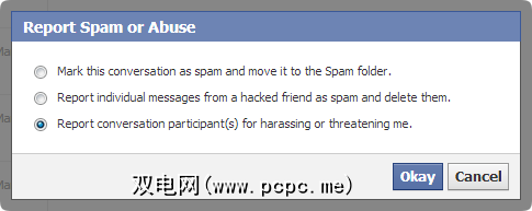 在以下窗口中,您可以将其设为三个选择:将对话标记为垃圾邮件,报告来自被黑客入侵的朋友的消息或报告发件人骚扰或威胁您。